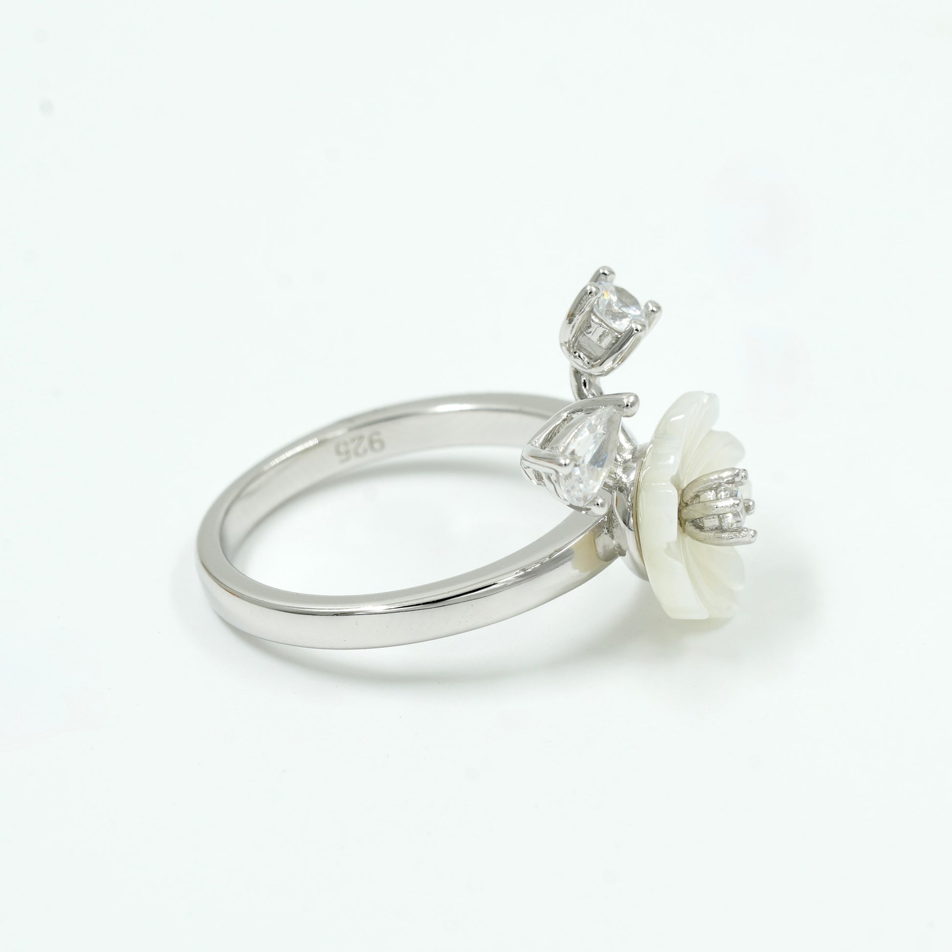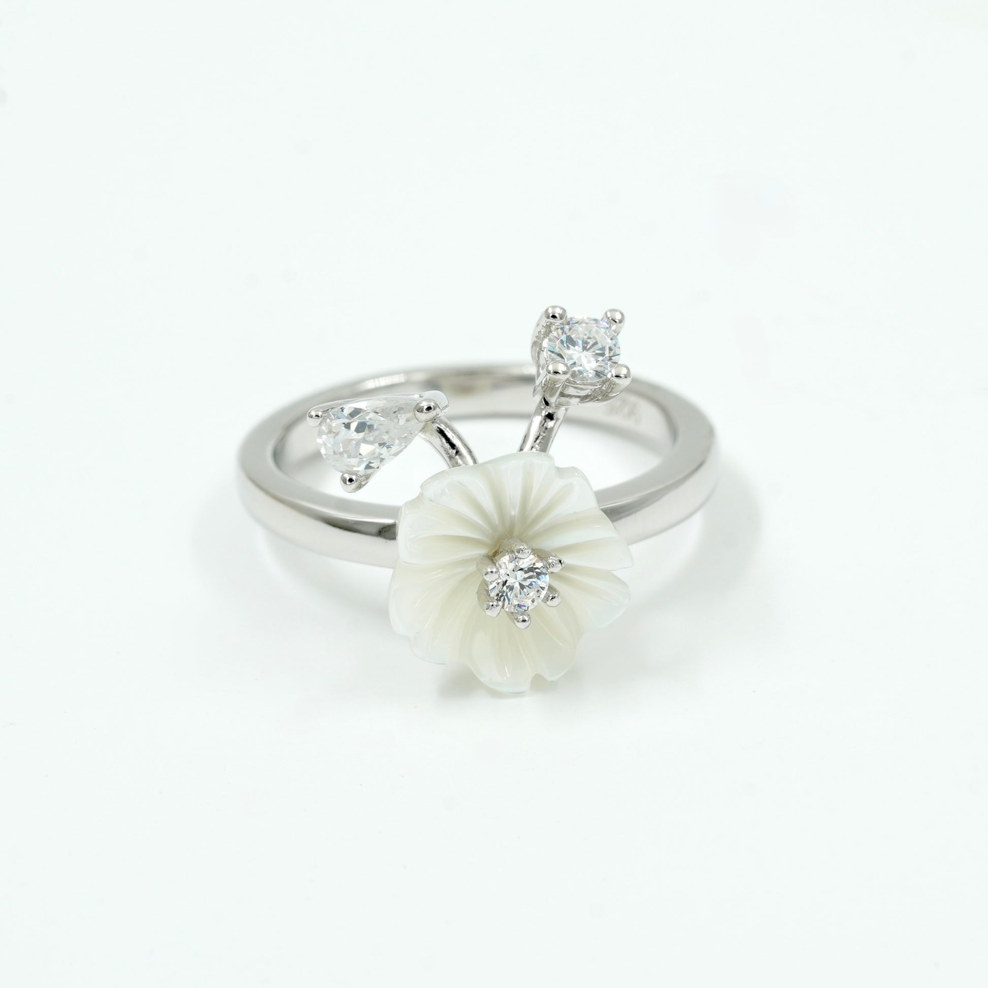 925 Silver Carved Floral Diamond Ring – Elegant White Stone with Dual Accent Stones