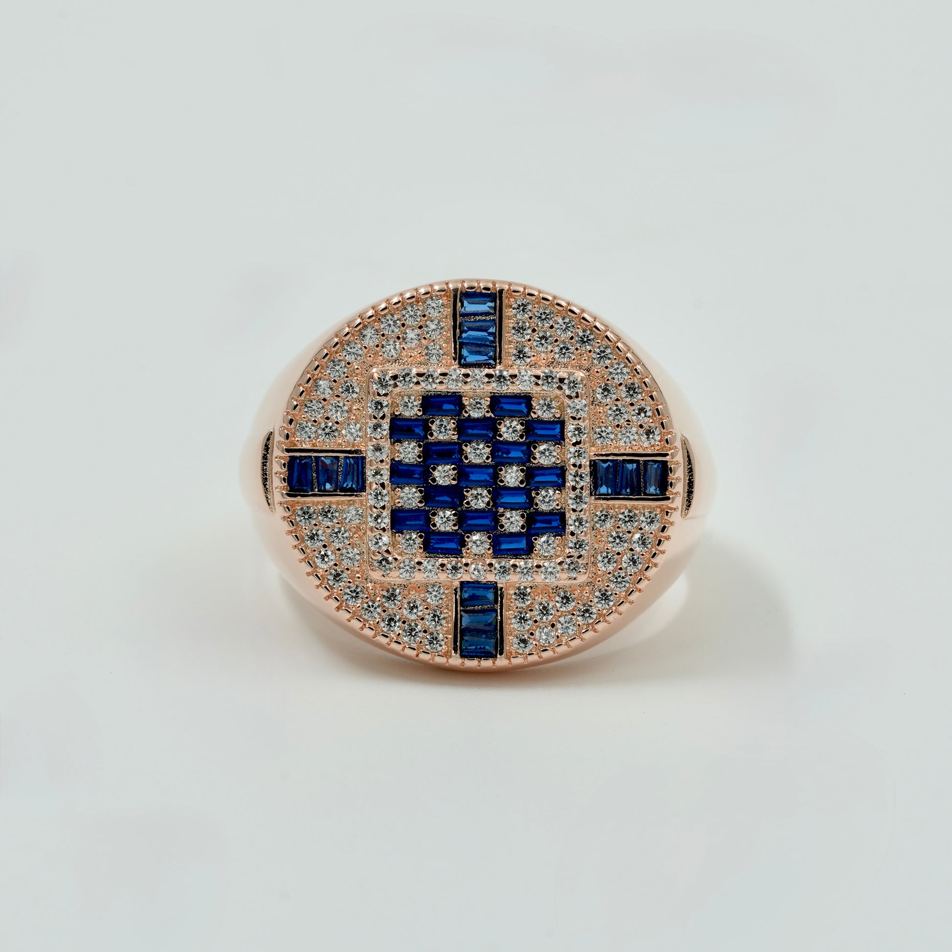 Bring home this bold and luxurious men’s rose gold finish silver ring, designed with a striking checkerboard pattern of deep blue sapphire stones surrounded by sparkling CZ diamonds. Crafted in pure 925 sterling silver, this piece is a perfect blend of modern style and royal elegance.