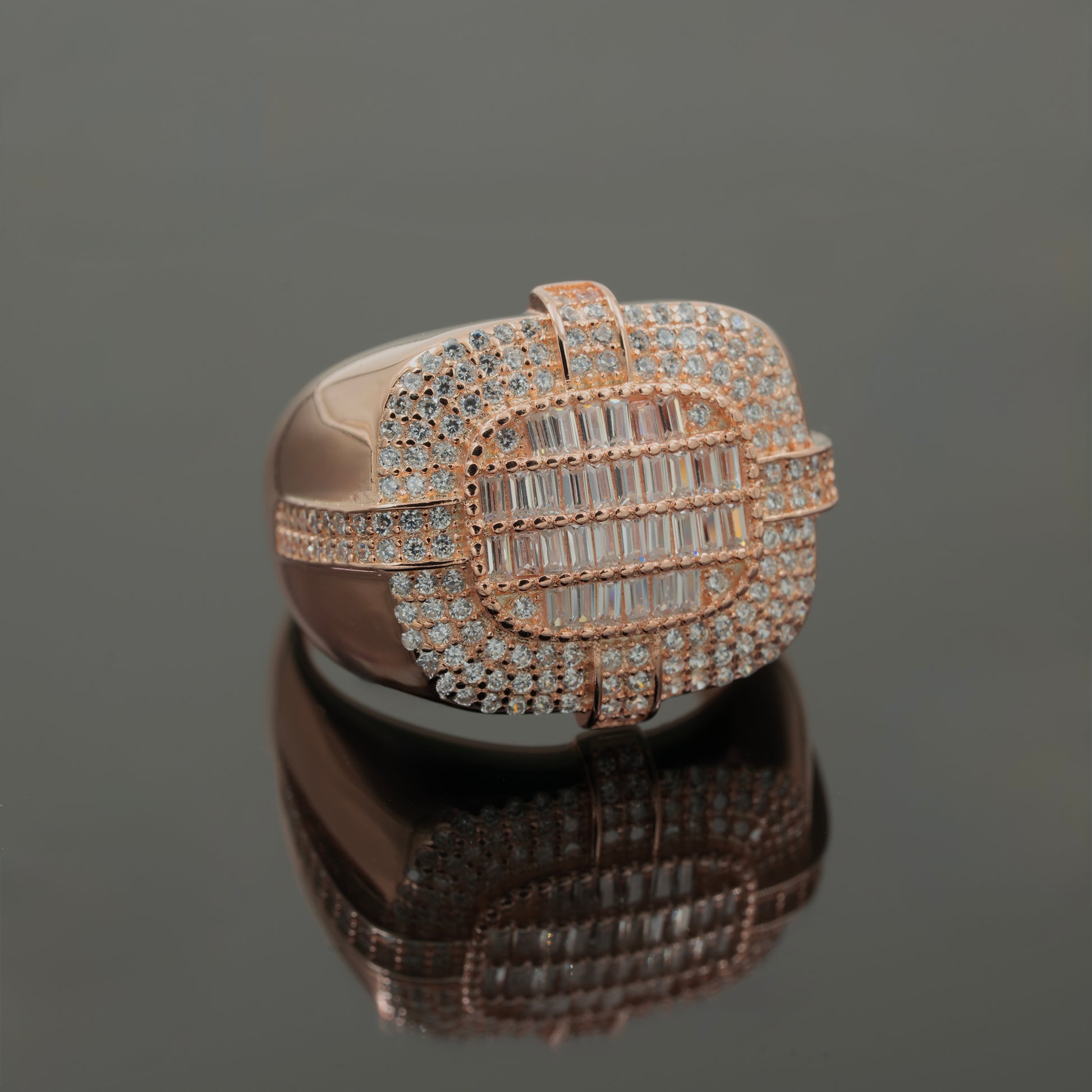 Premium men’s ring in 925 silver with rose gold plating and baguette CZ stones.