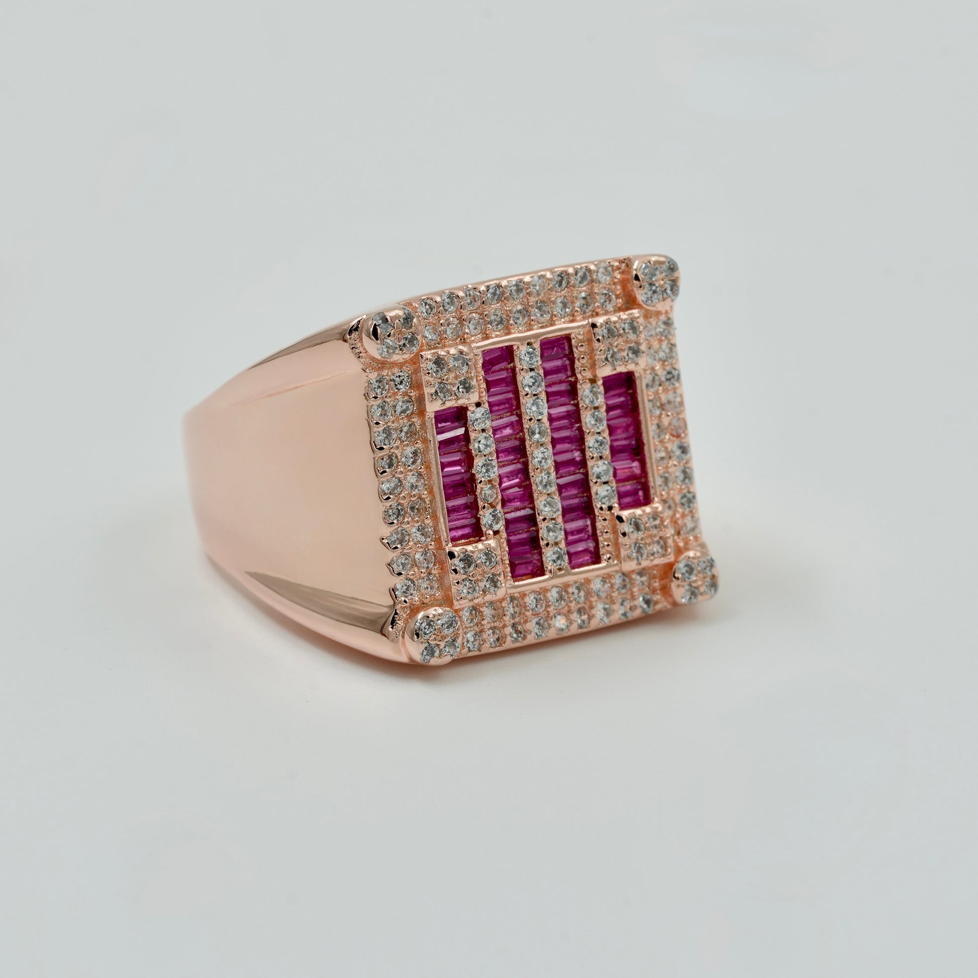 - Premium 925 silver with rose gold plating - Studded with ruby baguettes & CZ diamonds - Bold square designer men’s ring