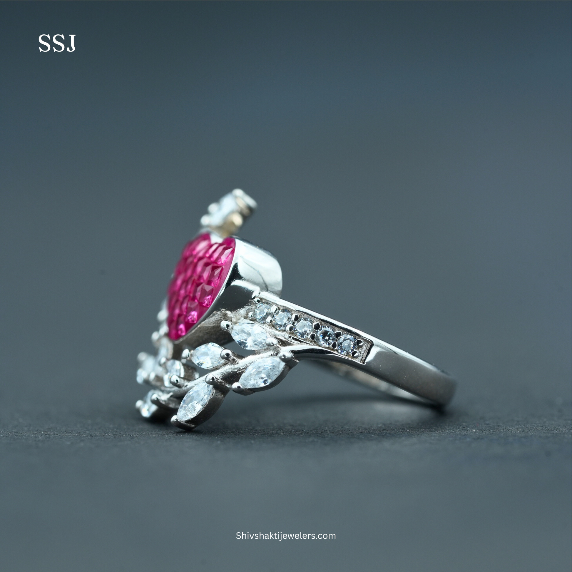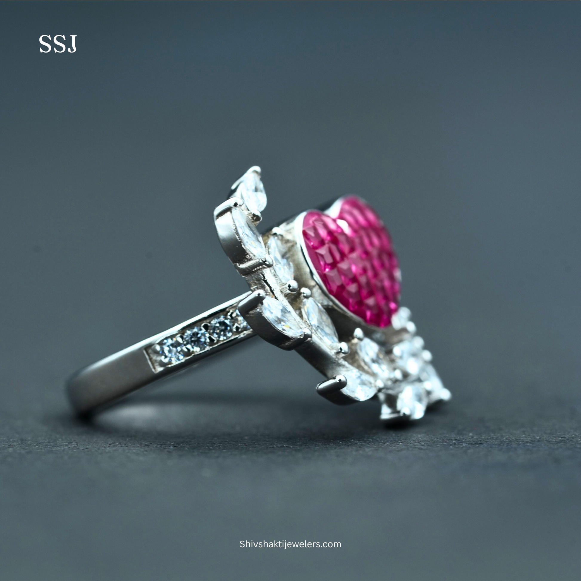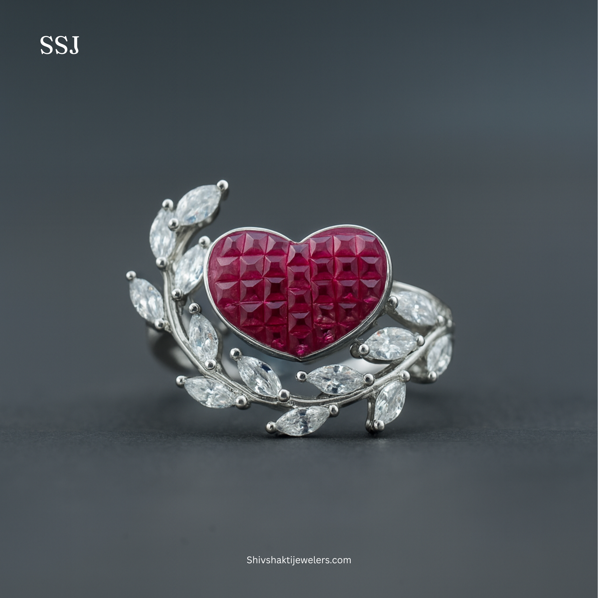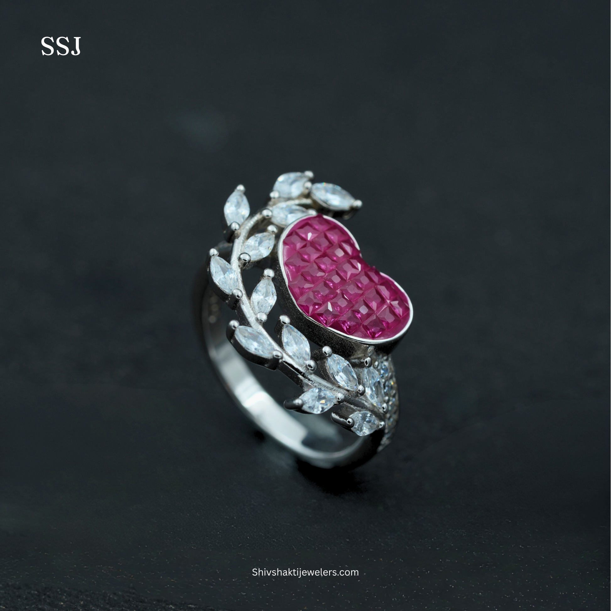 Fall in love with elegance. This premium 925 silver ring features a unique heart-shaped red gemstone, surrounded by intricately set marquise-cut white stones in a branch-like pattern. Perfect for gifting or adding romance to your everyday wear, this design speaks luxury with a modern twist.