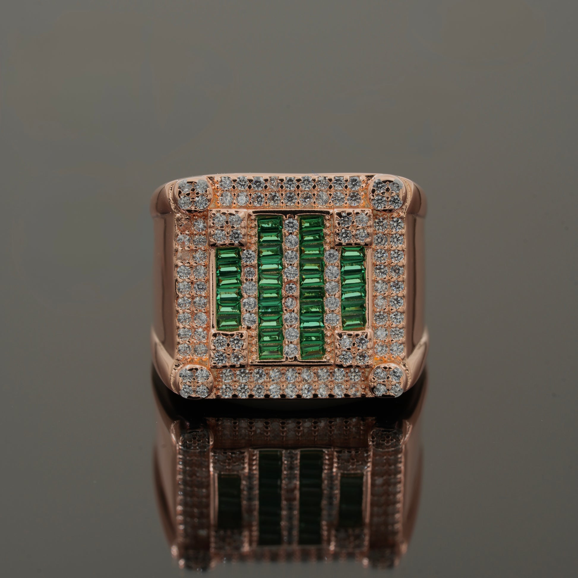 Add bold luxury to your collection with this men’s emerald statement ring in 925 sterling silver. The ring features baguette-cut green emerald stones arranged in vertical lines, highlighted with sparkling CZ diamonds in a square frame. Designed in rose gold plating, this bold and masculine ring is perfect for parties, weddings, and luxury styling. A premium men’s jewellery choice that blends tradition with modern fashion.