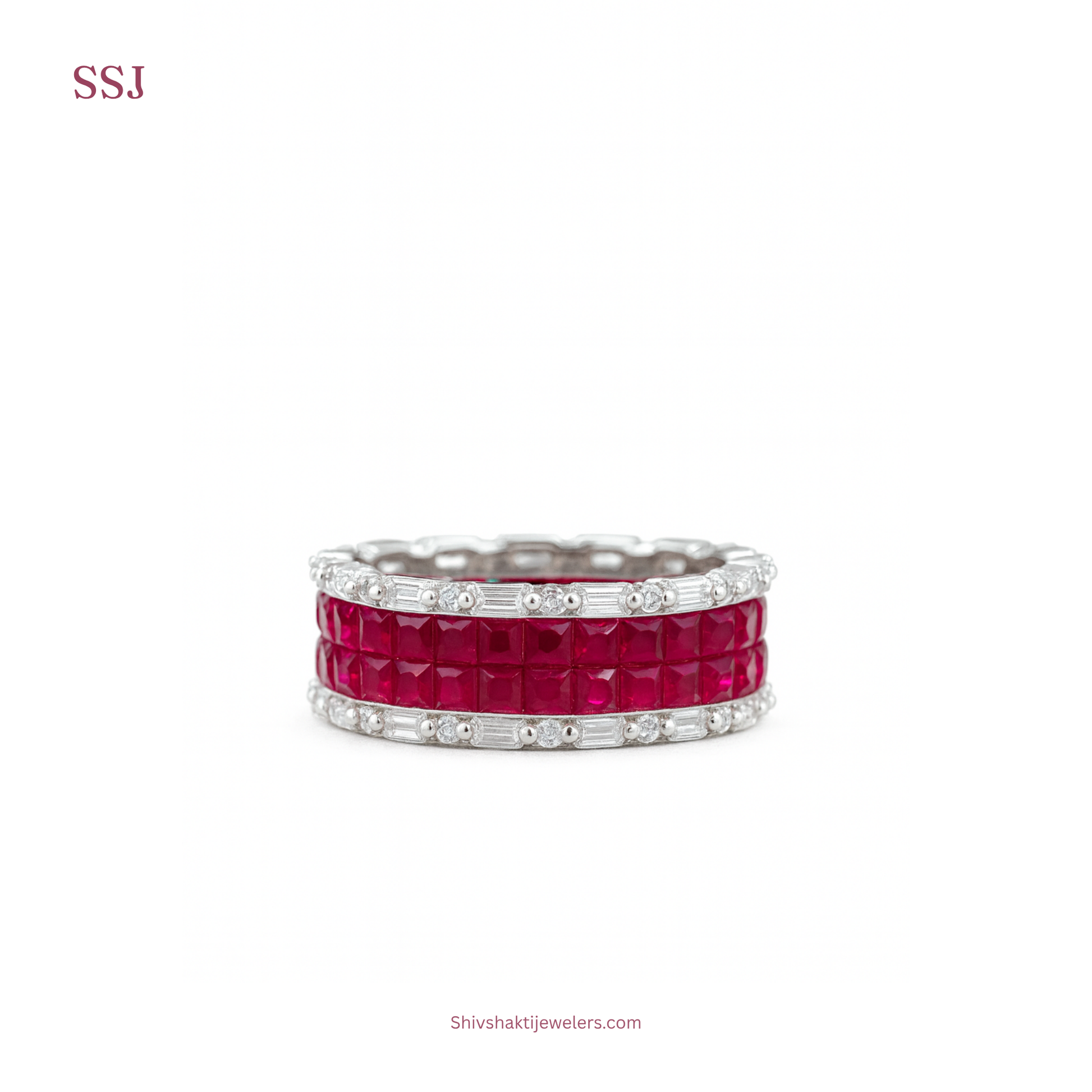 • Material: 925 Sterling Silver (Hallmarked) • Gemstones: Princess-cut Ruby stones • Accent Stones: Baguette & round-cut CZ diamonds • Width: Approx. 6.5mm • Finish: Rhodium-plated for lasting shine • Hypoallergenic & tarnish-resistant
